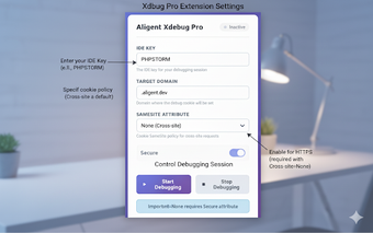 تبسط الواجهة البديهية لـ Aligent Xdebug Pro عملية تصحيح الأخطاء مع عناصر تحكم الجلسة بنقرة واحدة ومؤشرات بصرية لعرض حالات التصحيح النشطة. تقوم تلقائيًا بحفظ الإعدادات لاستئناف الجلسات بسرعة وتوفر ملاحظات فورية حول رسائل النجاح أو الخطأ. هذه الإضافة مفيدة بشكل خاص للمطورين الذين يعملون في هياكل الميكروسيرفيس أو مع أنظمة إدارة المحتوى بدون واجهة مستخدم وتصحيح واجهات برمجة التطبيقات، مما يجعلها أداة أساسية للفرق التي تهدف إلى تبسيط سير العمل في تطويرها.